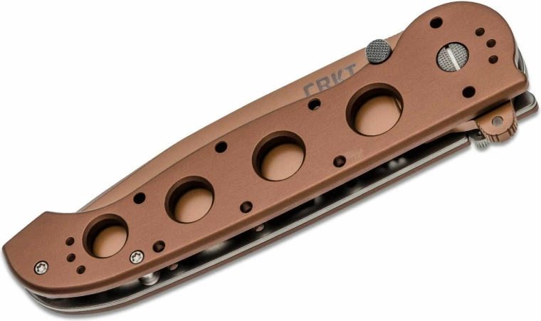 Robust lommekniv CRKT M16-14D Desert Tanto til hverdagsbrug og krævende taktisk anvendelse. Den tilbyder en tanto-klinge i AUS-8 stål med delvist savtakket æg, slidstærk TiN-belægning i kobberfarvet nuance og hurtig åbning via Carson-flipper eller tommelstuds. Sikkerheden sikres af liner lock med AutoLAWKS, let 6061-T6 aluminiumskaft med letvægtsåbninger og lommeclip for komfortabel bæring.