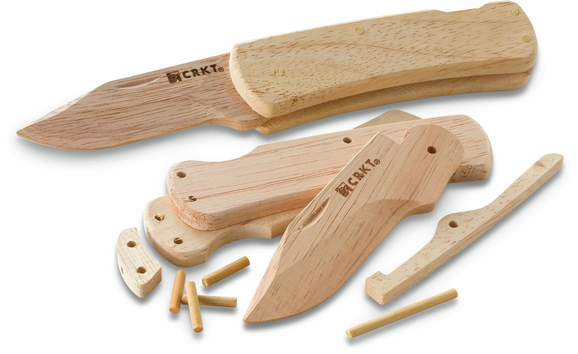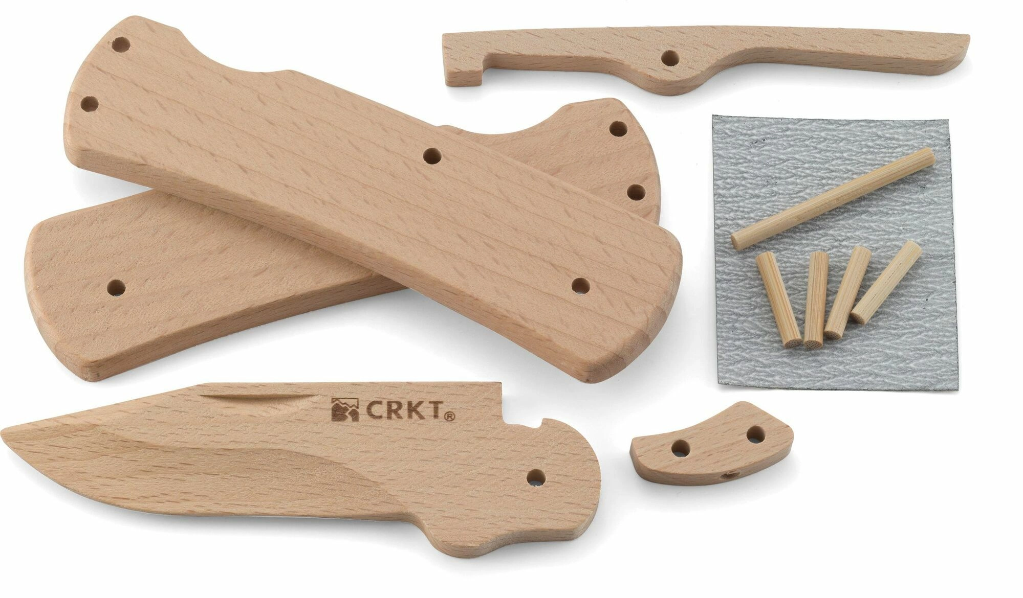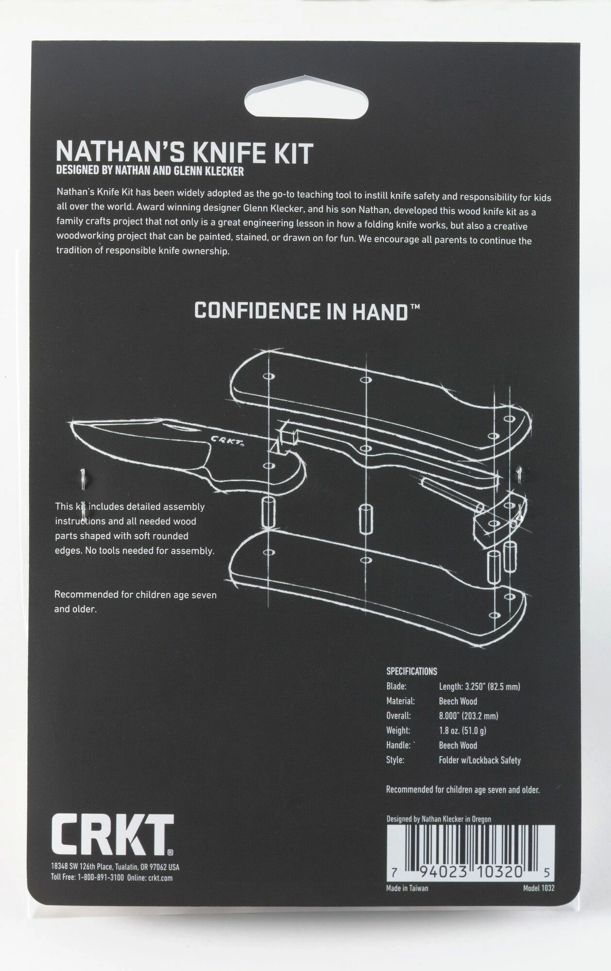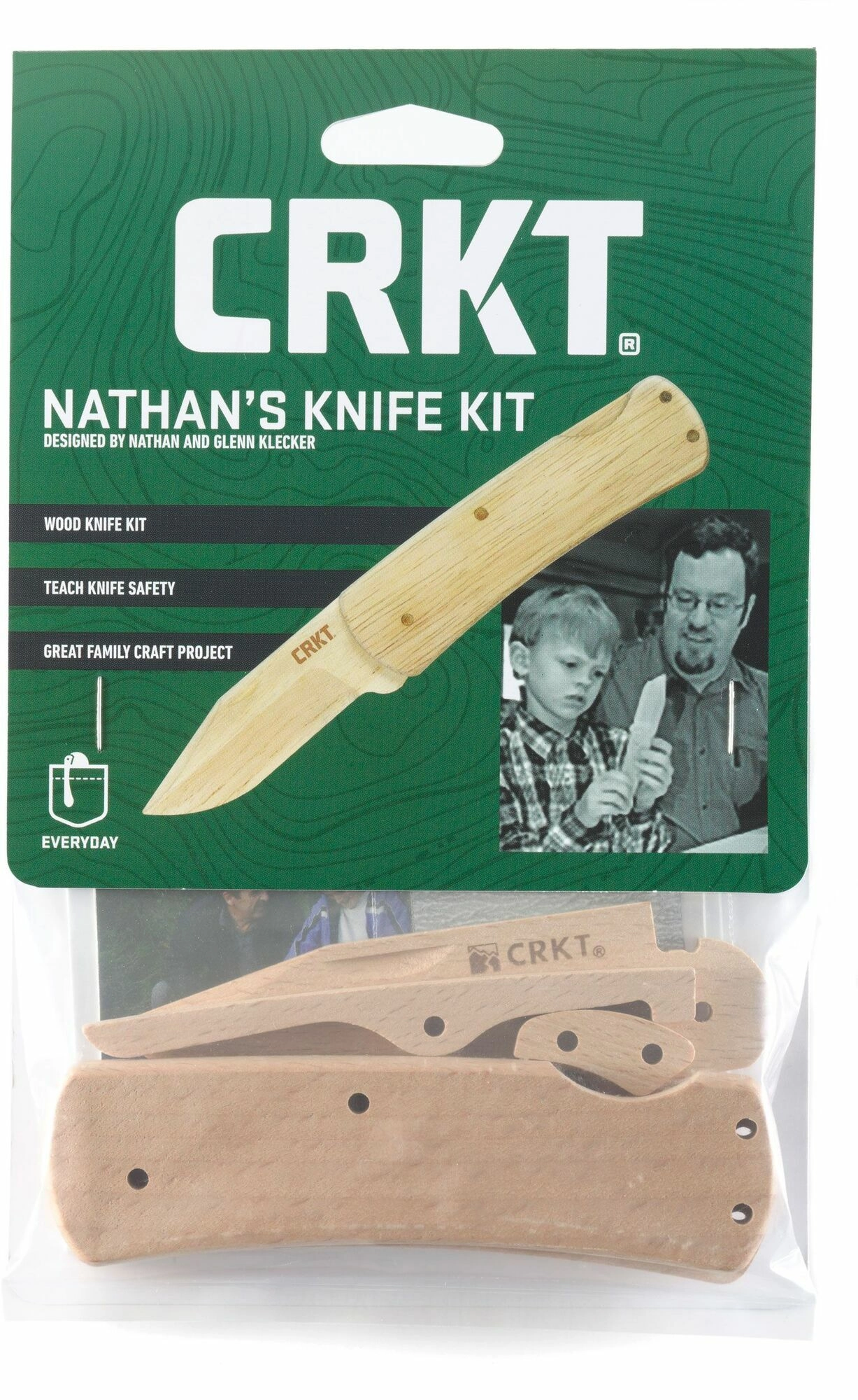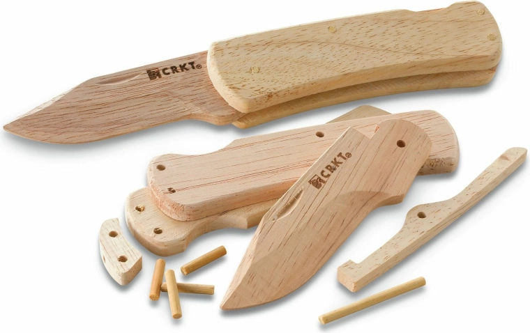 Lær principperne bag foldeknive sikkert og legende. Byggesættet CRKT Nathan's Knife Kit, inspireret af syvårige Nathan Kleckers idé, indeholder forberedte dele med forborede huller og alt, hvad du behøver til montering. Samlingen er enkel, kræver ikke værktøj, og resultatet er en fuldt funktionsdygtig model af en træ-lommekniv.