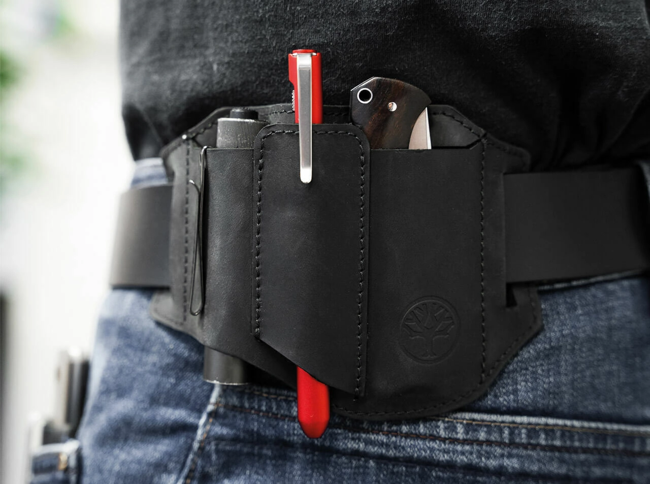Praktisk og elegant læderetui Bӧker ED-Three i sort er ideelt til daglig brug. Det tilbyder tre separate rum til kniv, lygte og pen, er fremstillet af kvalitets nubucklæder og prydes af et præget BӦKER-logo. Passer til bælter op til 4,4 cm og kan bæres på både højre og venstre side.