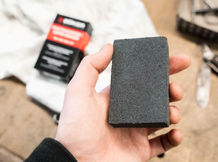 Perfekt til daglig pleje af køkken- og outdoor-knive, værktøj og metaldele. Den er let at bruge – stryg forsigtigt over det berørte område og øg gradvist trykket efter behov. For bedste resultat rengør på tør eller let fugtet overflade og arbejd med jævne strøg i sliberetningen.