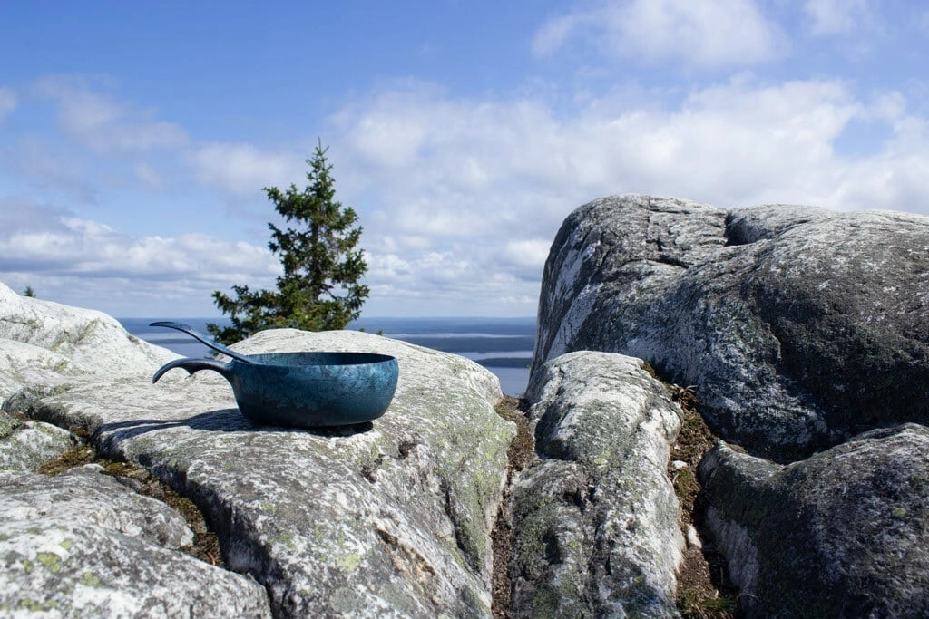 KUPILKA-skålen i traditionel kuksa-form er lavet af det innovative materiale Kareline® (50 % fyrretræ, 50 % termoplast). Det gør den stærk, let og modstandsdygtig over for krævende forhold i naturen. Den er nem at rengøre, absorberer hverken fugt eller lugte og bevarer form og farve i længden.