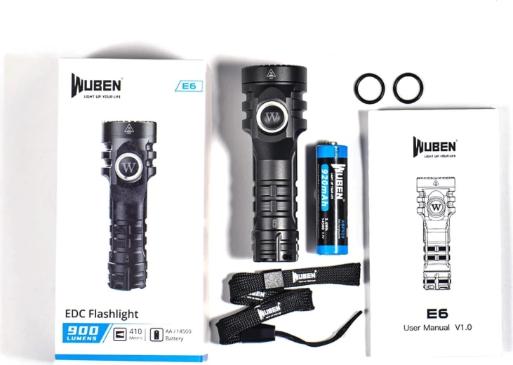Takket være fleksibel strømforsyning med Li‑ion 14500 (inkluderet) eller et almindeligt AA-batteri klarer E6 forskellige situationer derhjemme, på farten og i naturen. Den praktiske fjederclips gør det nemt at fæstne den til lomme, bælte eller rygsækrem, og øjet til snor giver en ekstra sikringsmulighed.