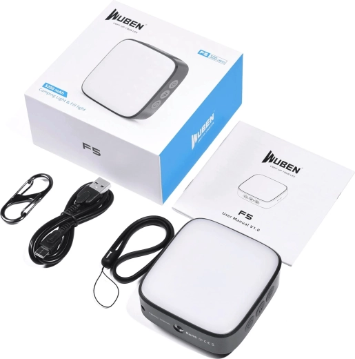 - WUBEN F5 lys, halsrem, karabinhage, USB-C opladningskabel