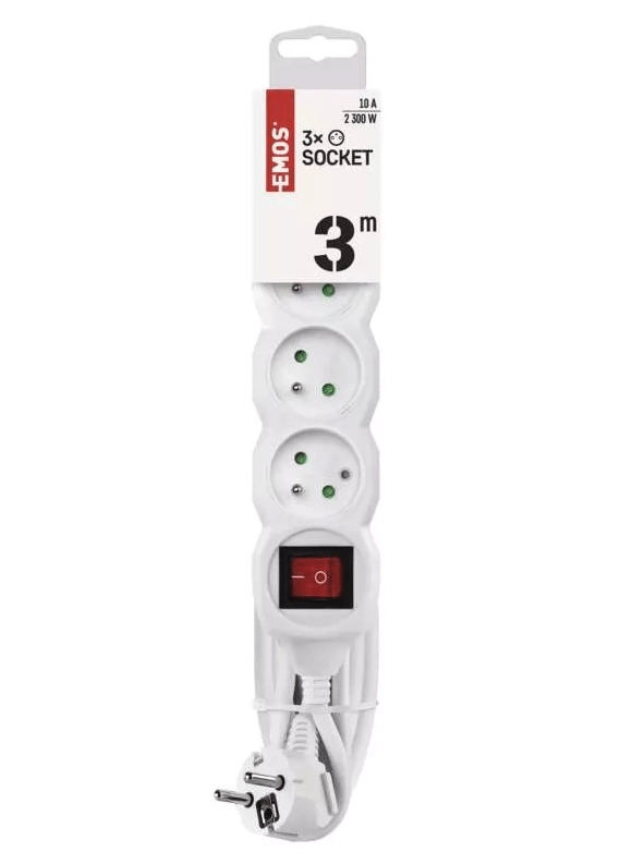 Den praktiske Emos forlængerledning med 3 m kabel og tre stik med fælles afbryder udvider pålideligt rækkevidden for strømforsyningen, hvor en fast vægkontakt ikke rækker. Den tilbyder nem betjening med afbryder, børnesikring for øget sikkerhed og maks. belastning 2.300 W i et elegant hvidt design.