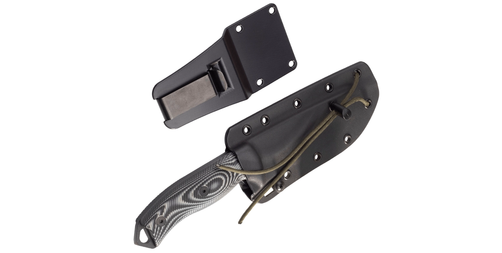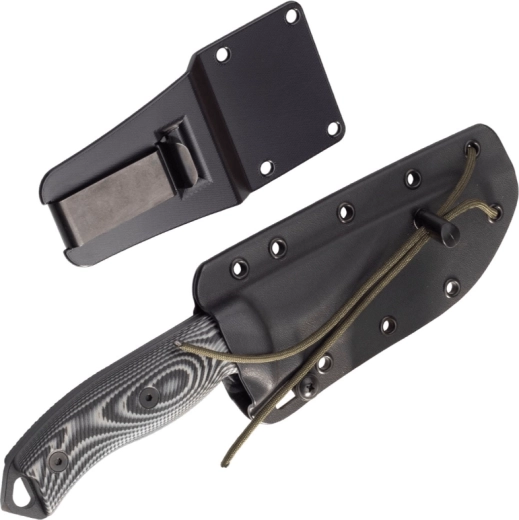 Greb i G10-materiale i sort/grå med 3D‑tekstur giver et sikkert og komfortabelt greb – også med handsker eller i vådt miljø. I enden af grebet findes en glasknuser og et hul til snor. Den medfølgende Kydex-skede sikrer sikker og stabil bæring af kniven under forskellige forhold.
