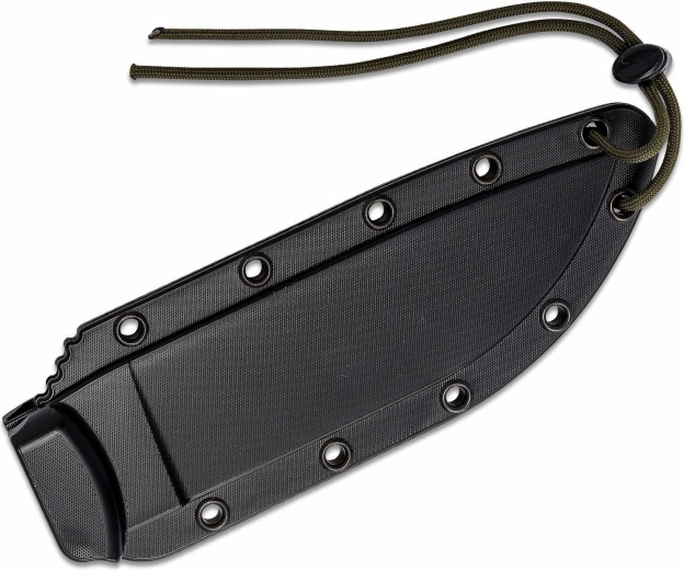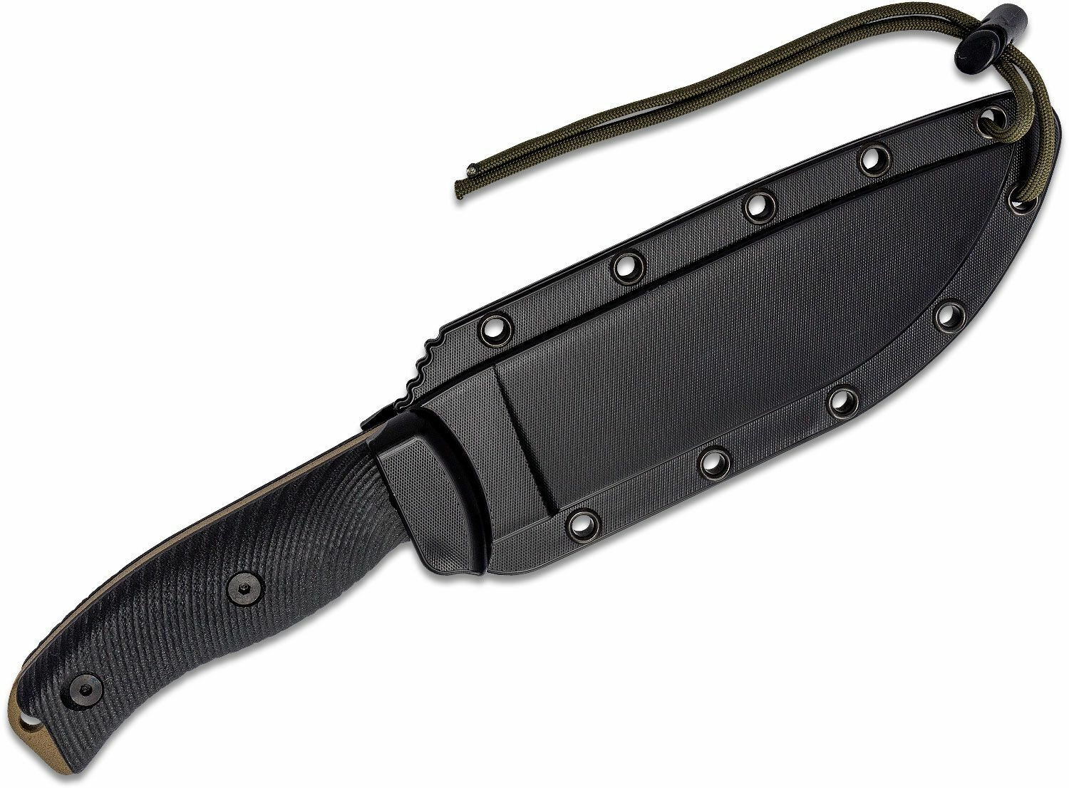 Håndtaget i G10 er 3D-profileret og tekstureret for sikkert greb, også med handsker eller i vådt vejr. Full tang-konstruktionen giver fremragende stabilitet og lang levetid. I enden er der hul til snor/lanyard for sikring eller lettere udtagning af kniven fra skeden.