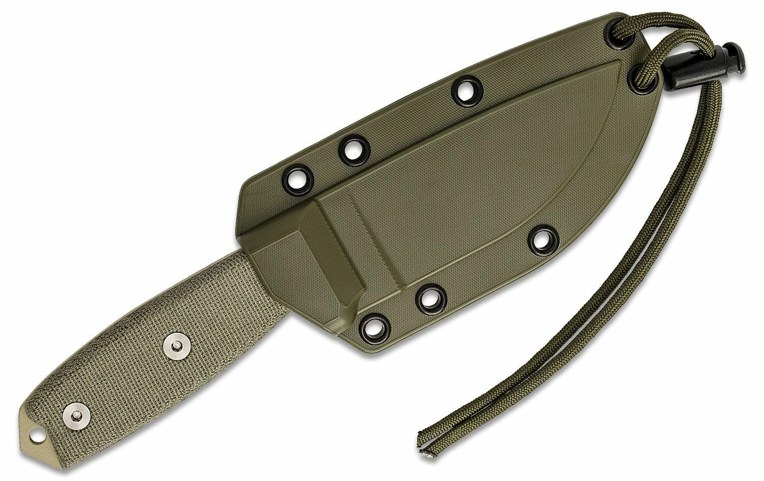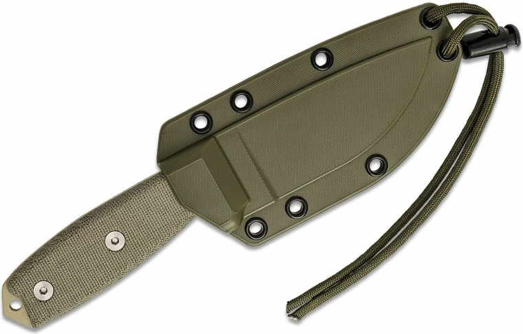 Det ergonomiske håndtag af Micarta i en sandbrun Desert Tan-nuance sikrer et sikkert greb selv under krævende forhold. Kniven er udstyret med et snorhulsøje og en praktisk glasknuser i enden af håndtaget. Med i pakken følger en robust plastskede i Desert Tan for sikker og hurtig montering i felten.