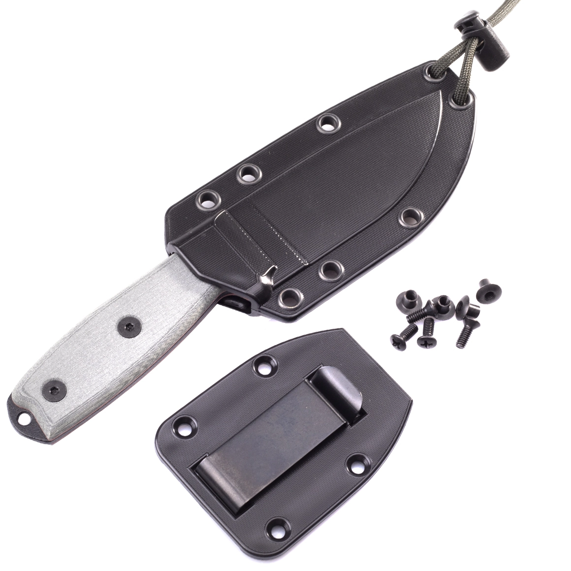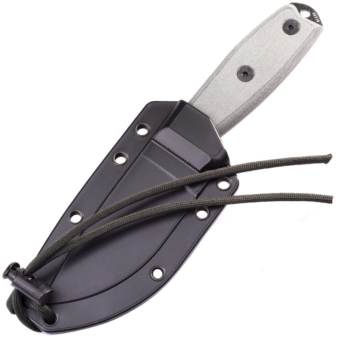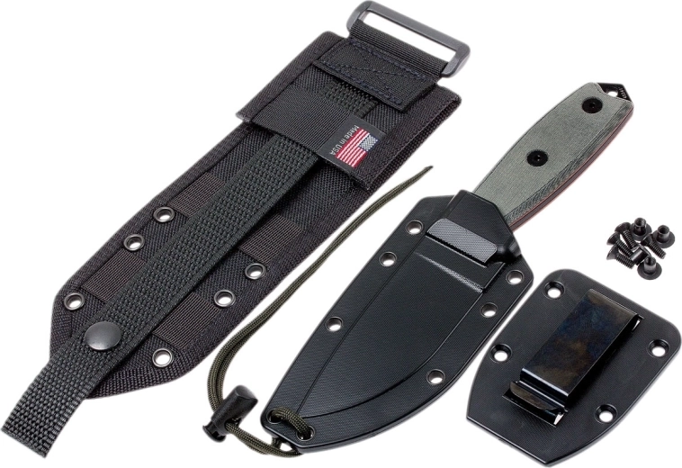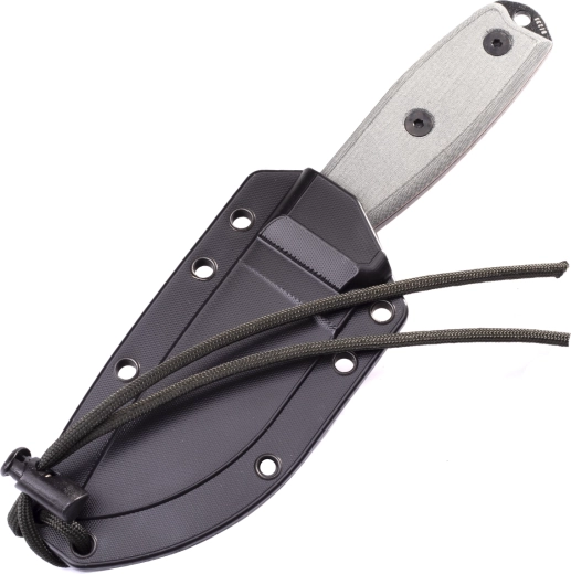 De teksturerede Micarta-skaller ligger sikkert i hånden selv i vådt vejr, og der er hul til sikkerhedssnor. Kniven suppleres af en let og stærk skede i Zytel med flere monteringsmuligheder – på bælte, vest eller rygsæk – takket være MOLLE-kompatibilitet og den medfølgende clip.