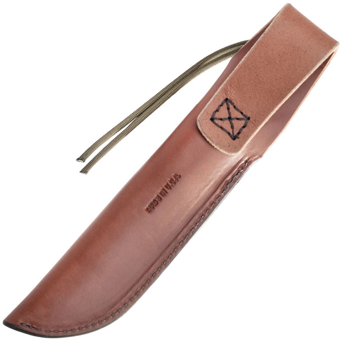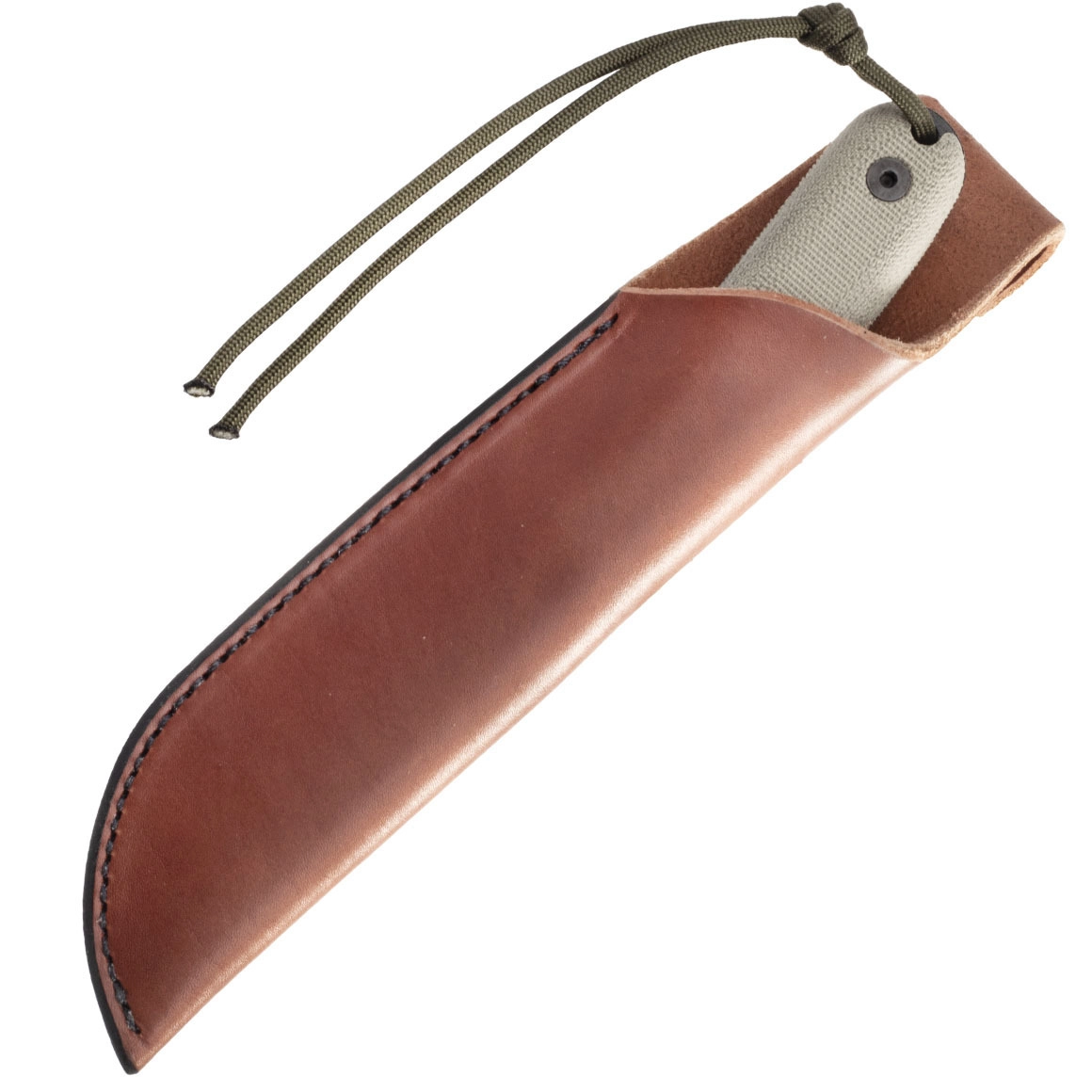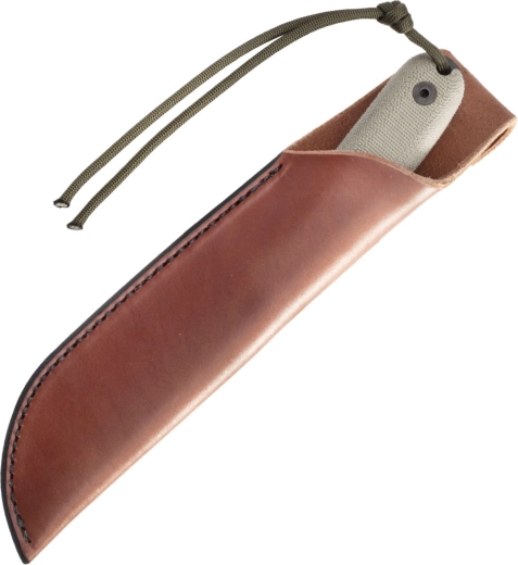 Det ergonomiske Micarta-skæfte i olivengrøn giver sikkerhed i både vådt og koldt vejr, og den fulde tang-konstruktion sikrer maksimal styrke og kontrol. Der medfølger et brunt læderhylster til bæltebæring, som beskytter klingen og giver nem adgang i terrænet.