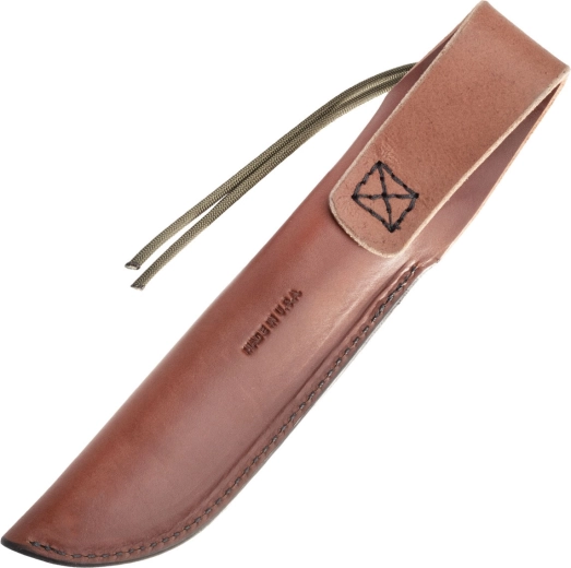 Brunt læderhylster med solid syning beskytter klingen og muliggør komfortabel og sikker bæring i felten.