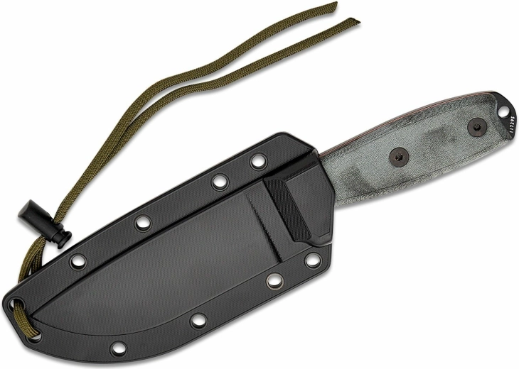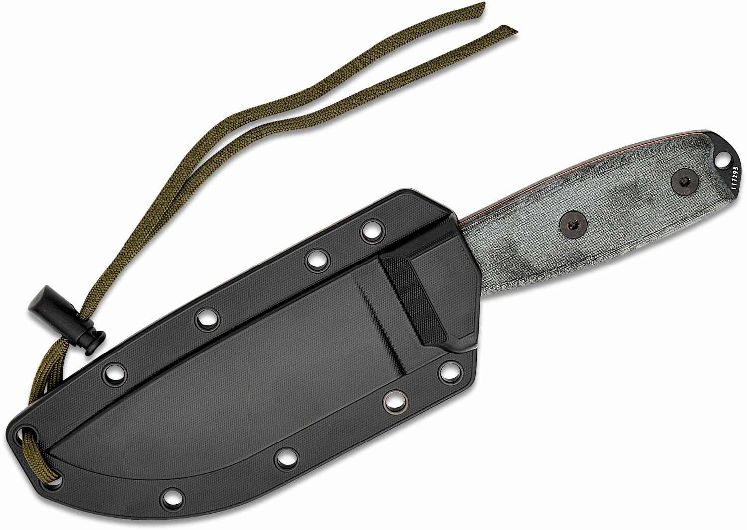 ESEE 4S er en pålidelig kniv designet til krævende forhold. Dens klinge i 1095 kulstofstål med sort overfladebehandling giver høj holdbarhed, fremragende skæreevne og delvis savtakket æg til effektiv skæring af stropper, reb og fibermaterialer. Det ergonomiske grå Micarta-håndtag ligger godt i hånden og giver et sikkert greb, selv i vådt miljø.