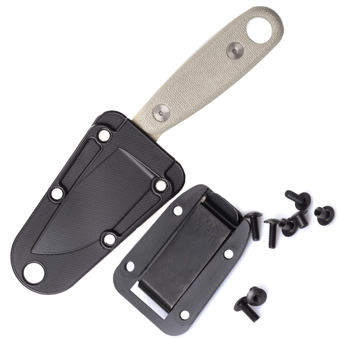 Let sort skede med klips muliggør bæring om halsen, i bæltet eller på udrustning – kniven er altid ved hånden.