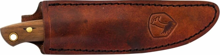 Skæftet i valnøddetræ ligger godt i hånden, giver et sikkert greb og har i enden et praktisk hul til snor. For sikker bæring medfølger en kvalitets læderskede, som beskytter klingen og gør den nem at bære i bæltet.