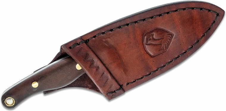 Den afrundede spids øger sikkerheden under brug, hvilket værdsættes af begyndere og yngre brugere under opsyn. Det formede skæfte af valnøddetræ ligger fremragende i hånden, nittede skæfteplader sikrer stabilitet, og hullet til snor giver mulighed for sikkerhedsstrop eller ophæng. Den naturlige overfladebehandling giver klingen modstandsdygtighed og et autentisk udseende, mens læderskeden muliggør sikker bæremulighed i bæltet.