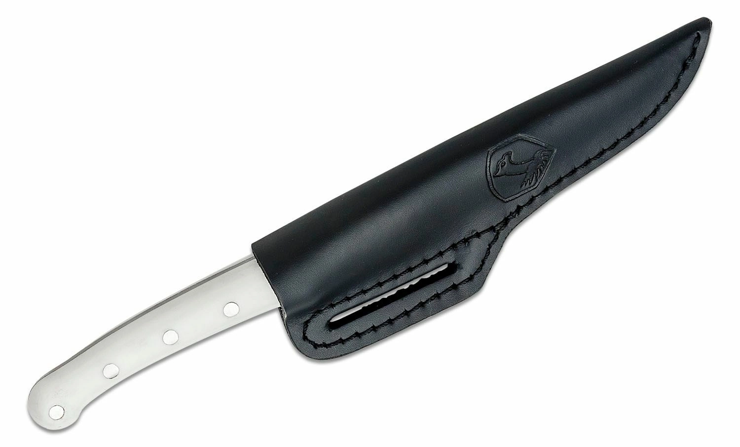 Det ergonomiske hvide håndtag af det slidstærke materiale Micarta giver et sikkert greb selv i vådt miljø, og nittet montering øger den samlede holdbarhed. Kniven leveres med læderetui for sikker og komfortabel bæret på bæltet.