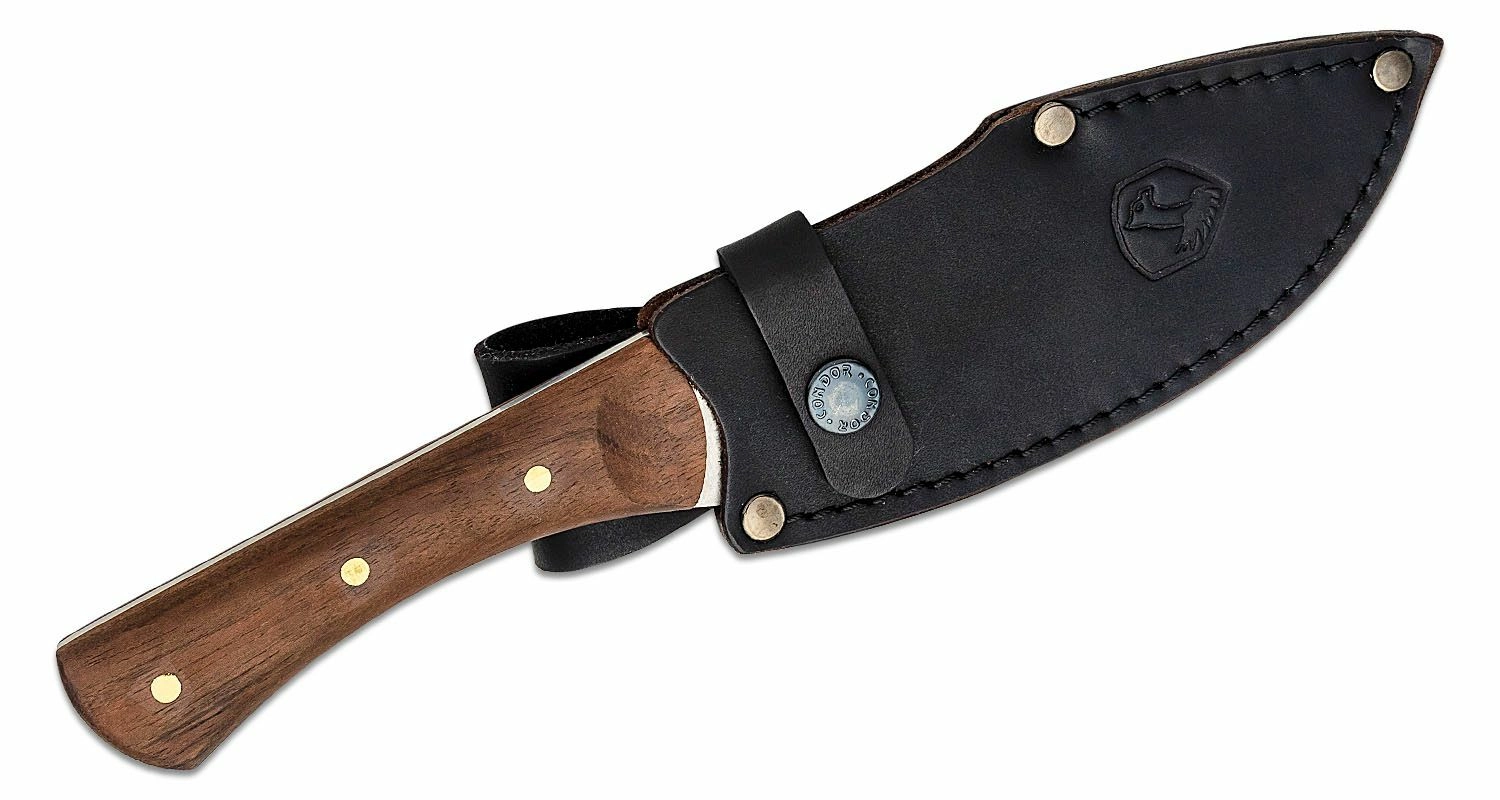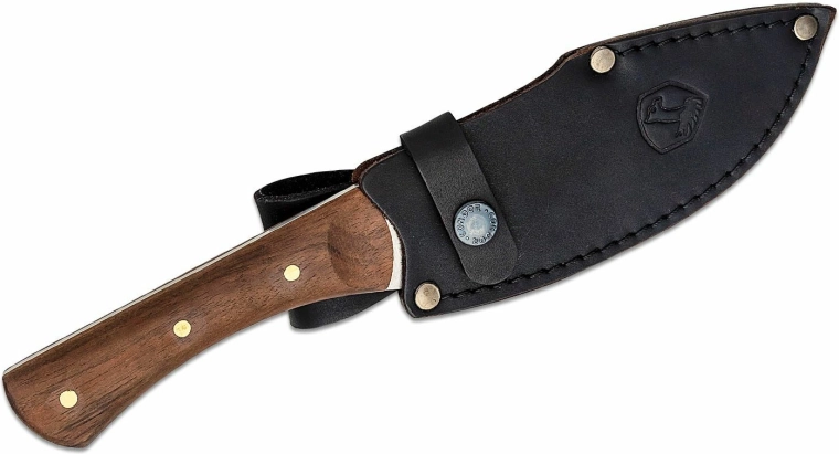 Ståltypen 440HC giver en afbalanceret kombination af korrosionsbestandighed, skarpholdbarhed og nem slibning. Det ergonomisk formede håndtag i valnøddetræ giver et sikkert og behageligt greb selv under længere arbejde. Den mørke læderskede muliggør sikker opbevaring og bæring i bæltet.