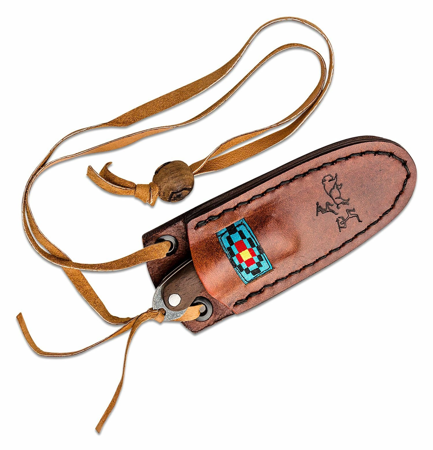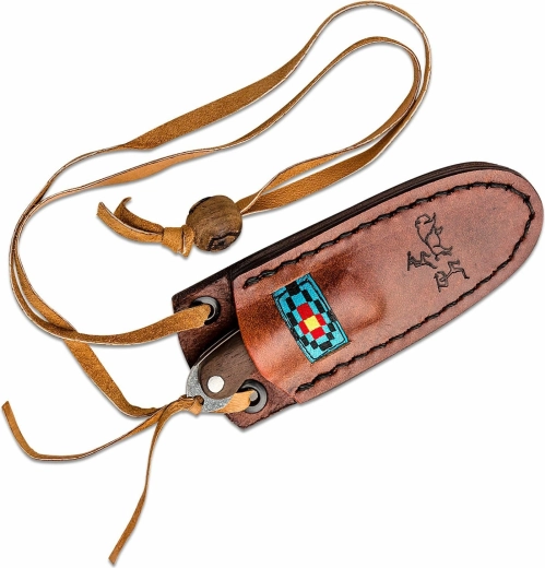 Skæftet af valnøddetræ kombineret med turkis giver et behageligt og sikkert greb selv under udfordrende forhold. Kniven leveres med en læderskede dekoreret med jagtmotiv og snor, som muliggør sikker og stilfuld bæring om halsen.