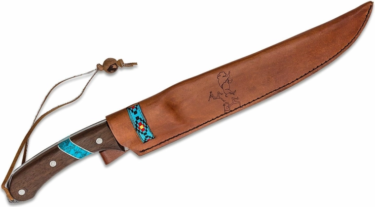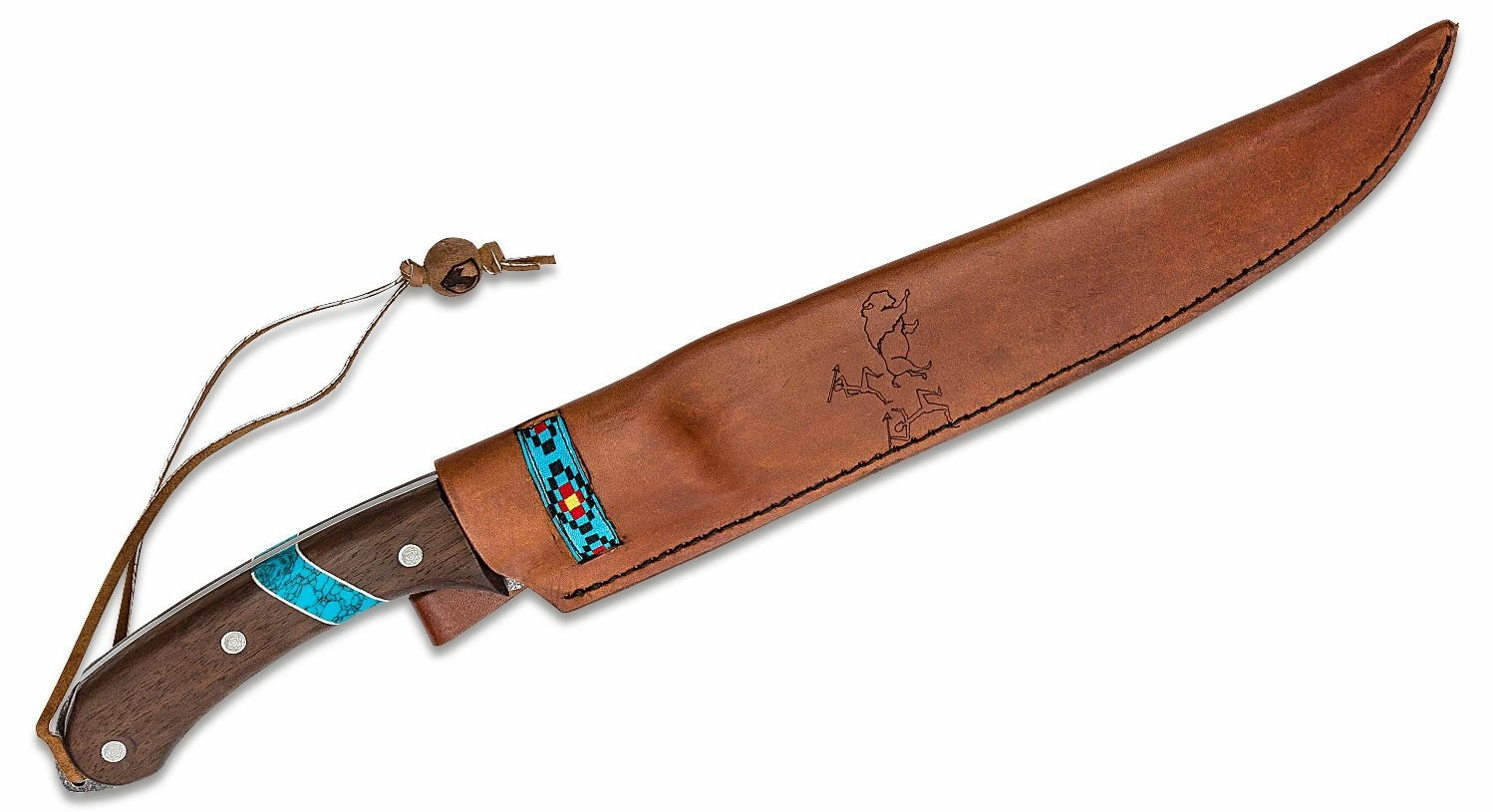 Skæftet af robust valnøddetræ, suppleret med et turkis element, ligger godt i hånden og giver et sikkert greb. Et praktisk hul til snor øger sikkerheden under arbejdet. Læderetuiet med traditionel udsmykning giver behagelig og stilfuld bæring.