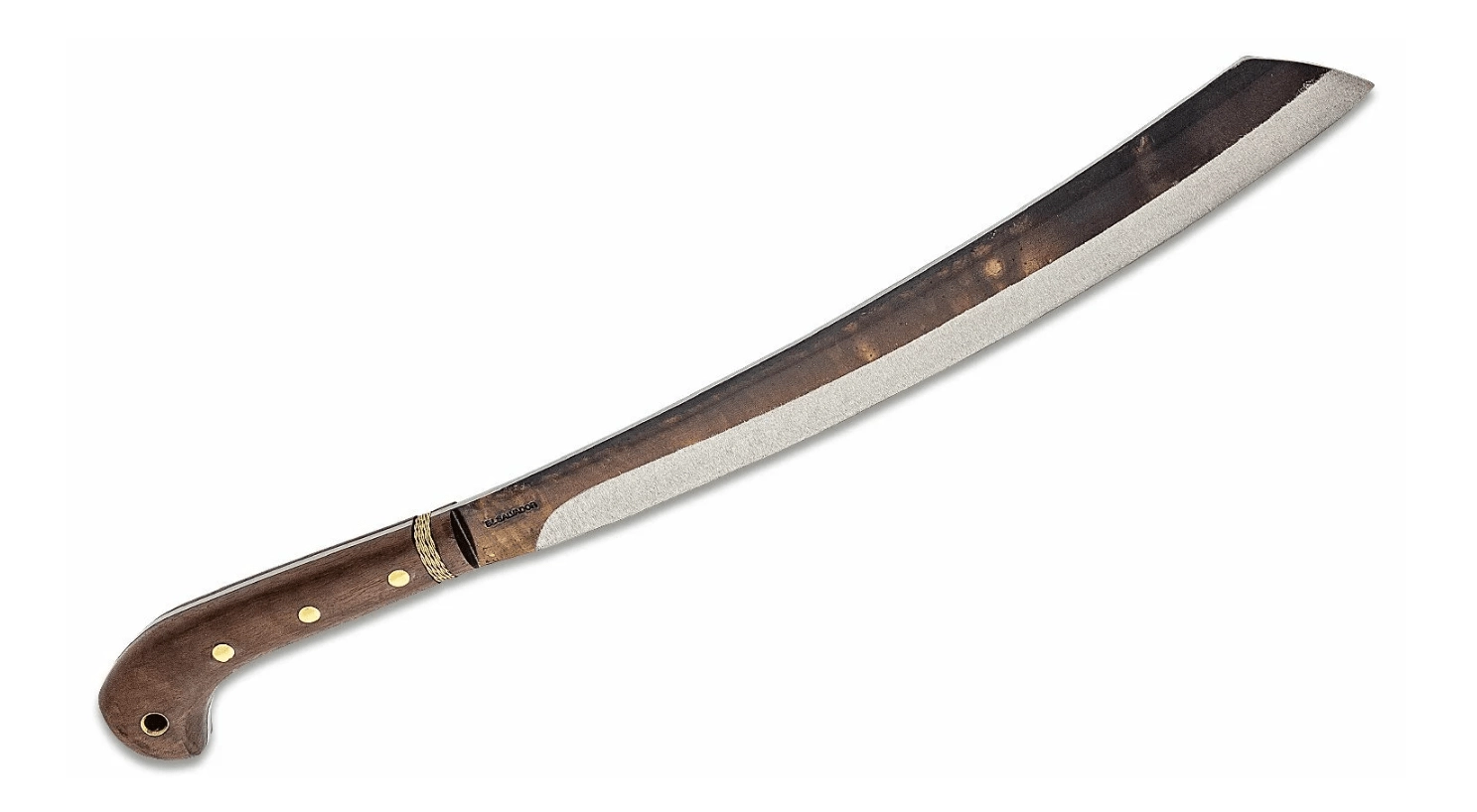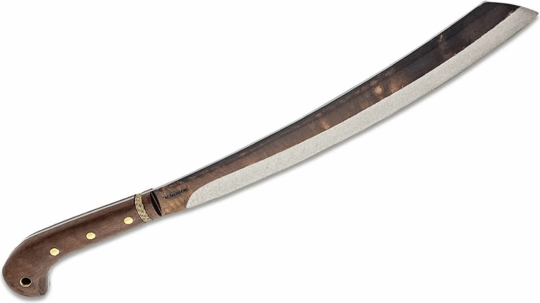 Robust machete Condor Duku med asiatisk form klarer sikkert opskæring af træ og krævende outdoorarbejde. Den har en klinge i 1075 kulstofstål med glat æg og en naturlig patina for et rustikt udseende. Det hårde træhåndtag med messingtråd og udvidet ende sikrer et sikkert greb. Medfølger kvalitetslæderskede.