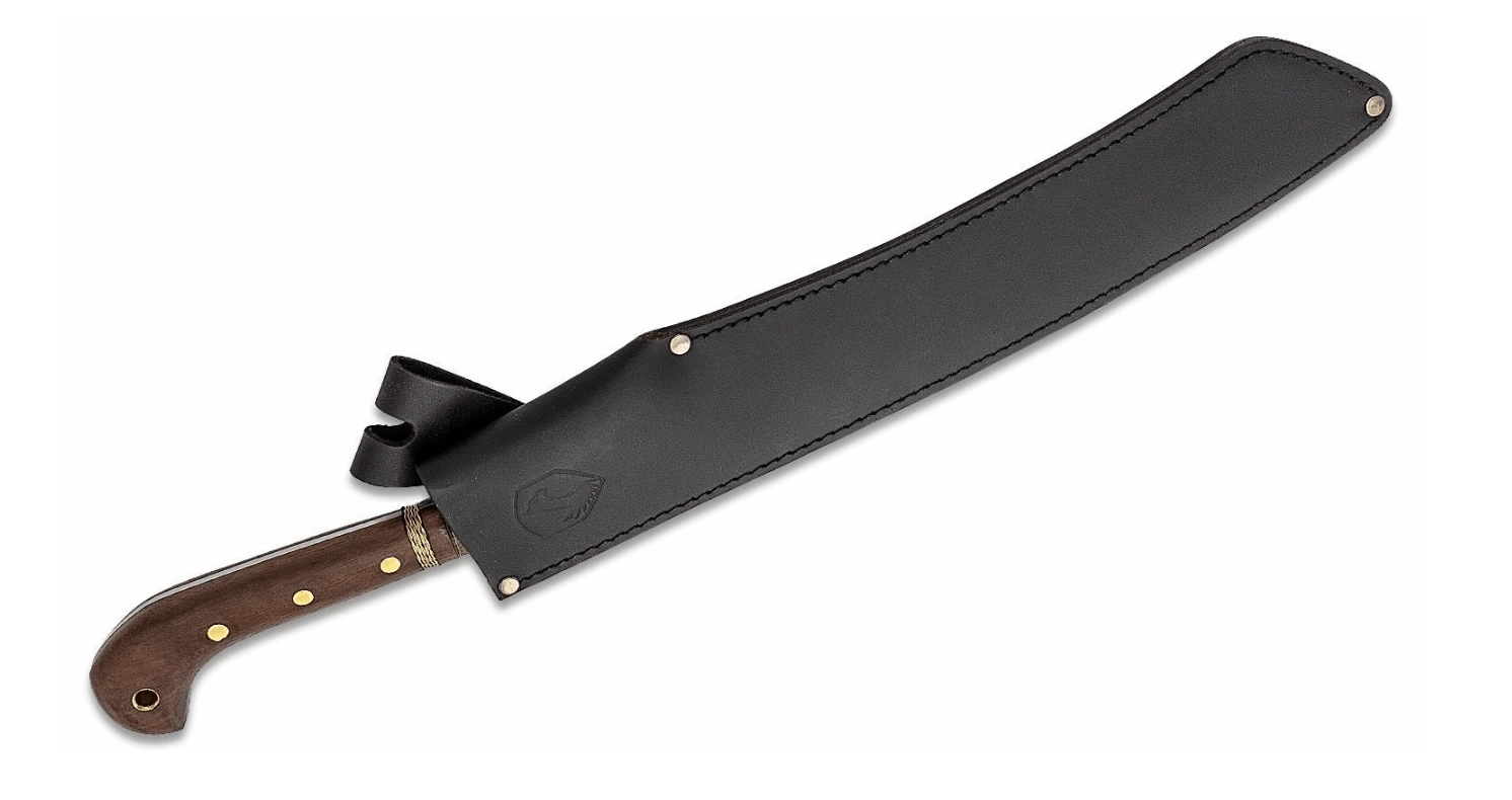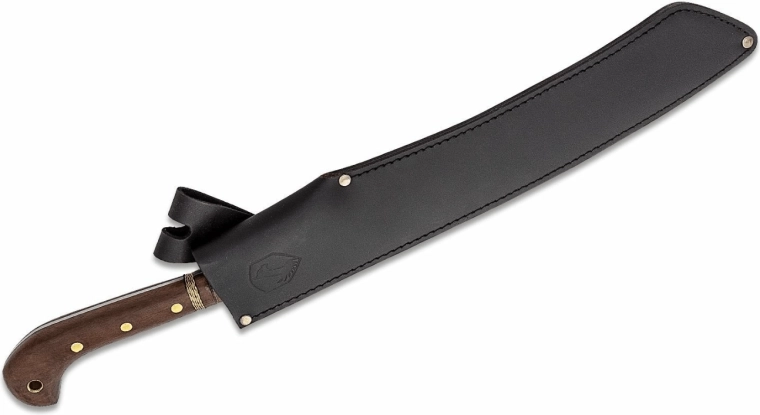 Det ergonomiske håndtag i hårdt træ med dekorativ messingvikling ligger fremragende i hånden, mens den udvidede ende forhindrer at hånden glider ved kraftige hug. For sikker bæring medfølger en robust læderskede.
