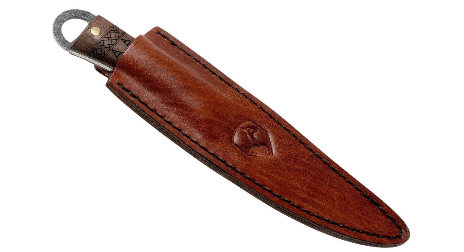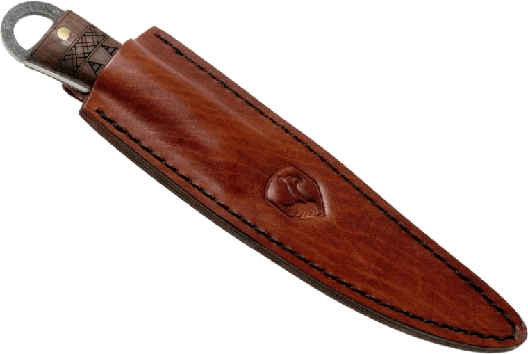 Skæftet i kvalitetsvalnøddetræ med markant åretegning er fastgjort til klingen med tre messingnitter. I enden af skæftet findes et ståløje til snor eller rem. Med i pakken følger en præcist udført læderskede til sikker og stilfuld bæring i felten såvel som i samlingen.