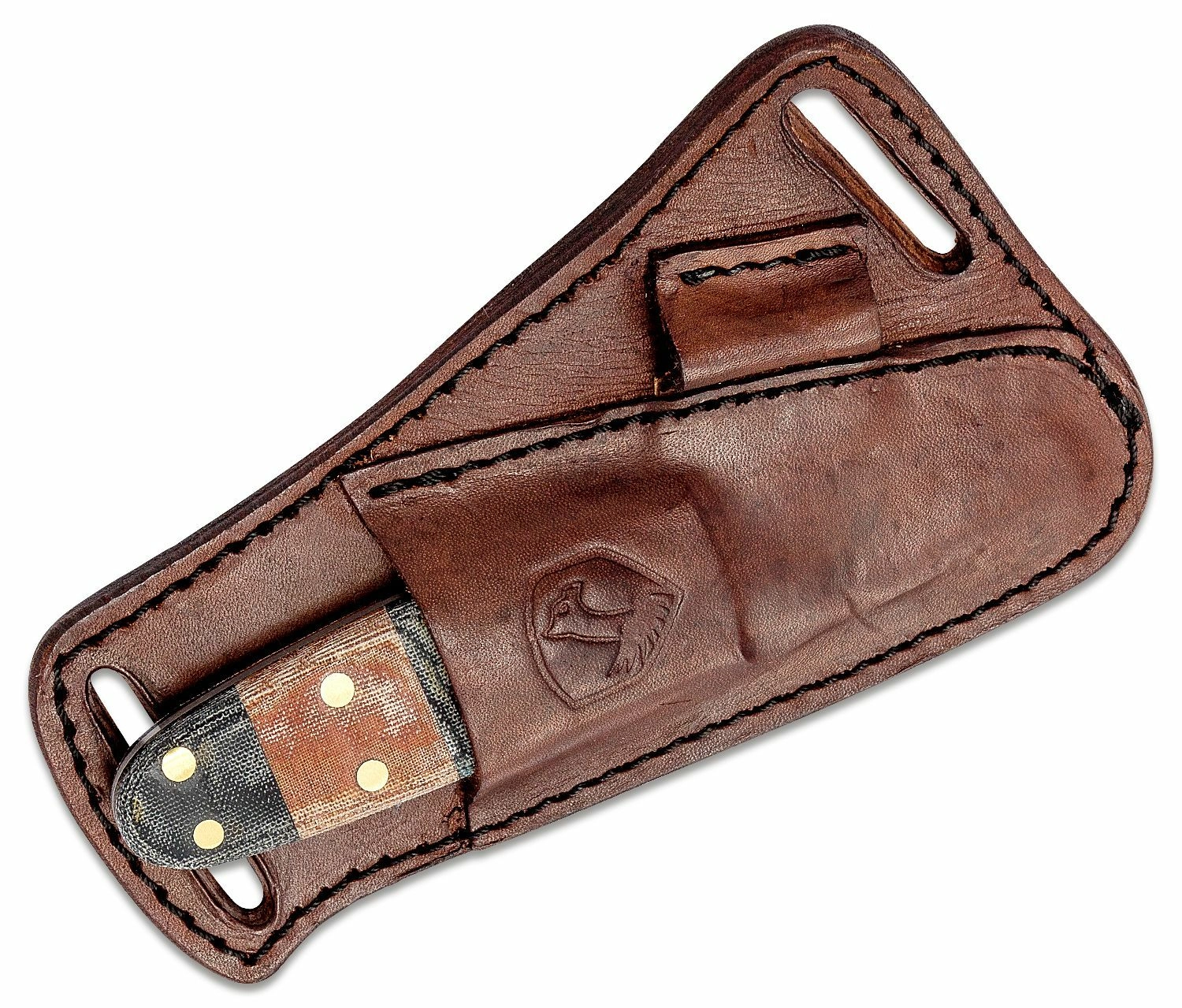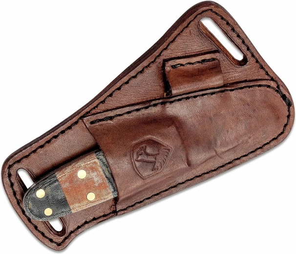 Skæftet af slidstærk micarta i brun-sort giver et sikkert greb selv i vådt føre. Messingnitter bidrager med både stabilitet og æstetik. Kniven leveres med en kvalitetslæderskede for komfortabel og sikker bærebæring i bæltet.