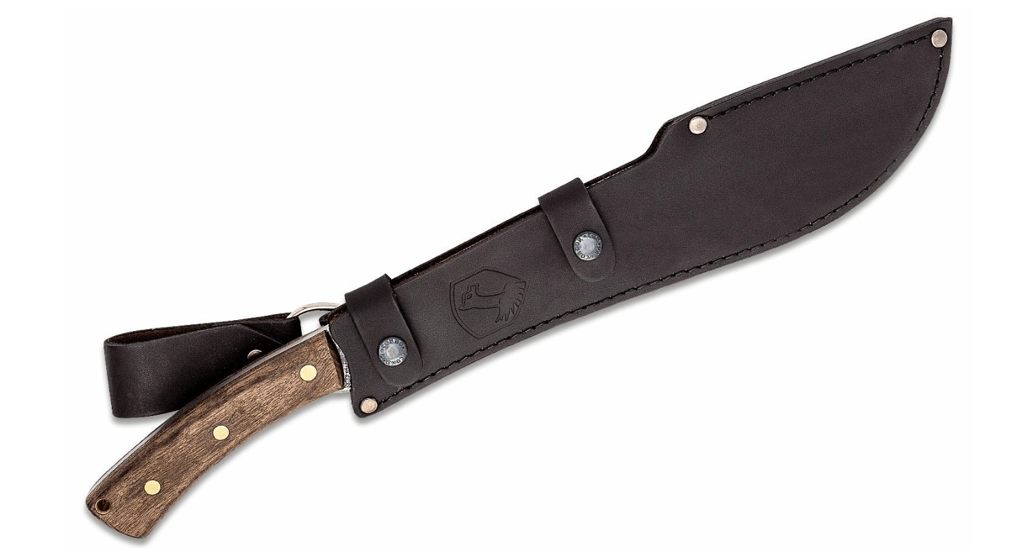 Condor Jungolo macheten er et pålideligt værktøj til hugning og rydning i felten. Den mellem-lange klinge af robust 1075 kulstofstål er let at slibe, holder skæret fremragende, og den naturlige overfladebehandling giver et rustikt og slidstærkt udtryk. Det ergonomisk formede håndtag i valnød med messingsnitter og snøreøje sikrer et sikkert greb selv under længere arbejde.