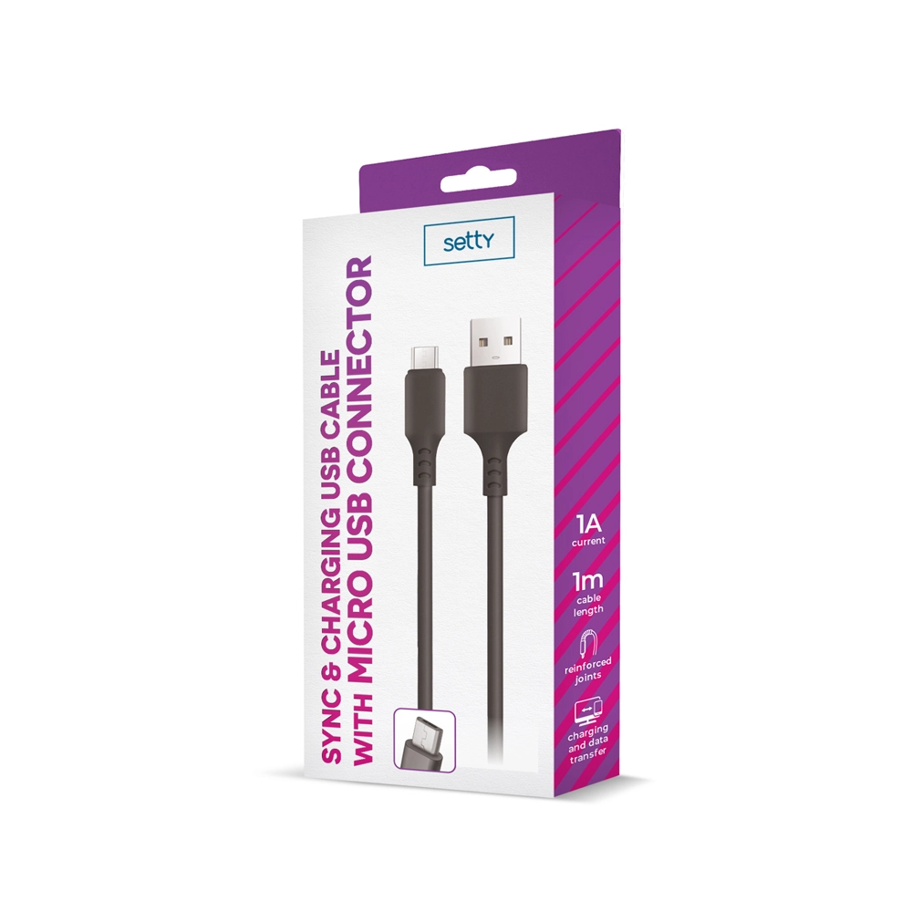 Setty USB – microUSB-kablet er et universelt tilbehør til enheder med micro‑USB-stik. Det giver en stabil forbindelse til laptop, PC eller oplader og sikrer sikker og effektiv opladning med en strøm på op til 1 A.