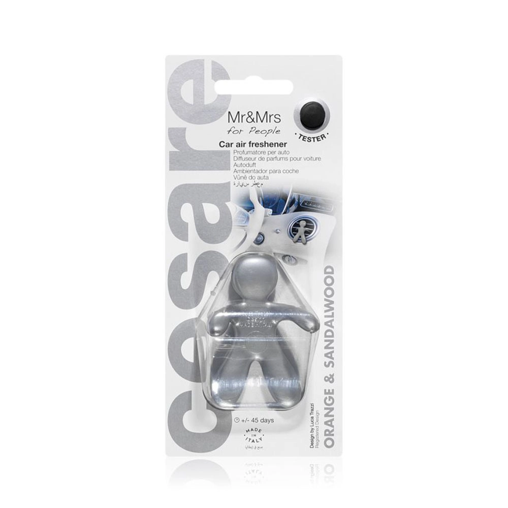 Frisk bilen op med den ikoniske luftfrisker Mr & Mrs Fragrance Cesare i sølv. Den elegante figur klikkes let på ventilationsristen og frigiver med luftstrømmen en intens duft af appelsin og sandeltræ. Duften er skabt af æteriske olier uden alkohol, så den er behagelig, naturlig og skånsom.