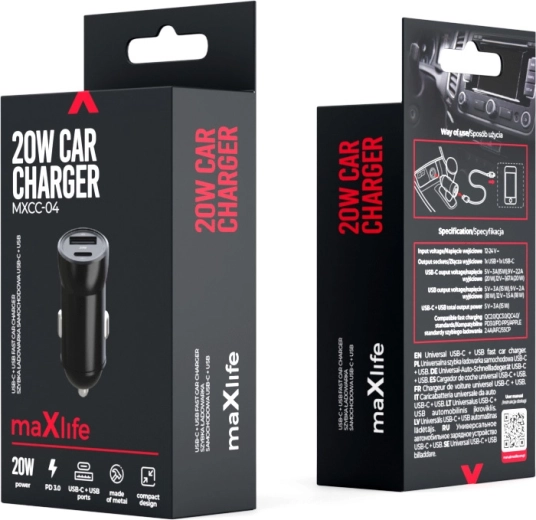 Hold dine enheder opladede på farten. Bilopladeren MAXLIFE MXCC-04 understøtter de moderne protokoller Power Delivery 3.0 og Quick Charge 3.0, hvilket hurtigt og pålideligt fylder strøm på telefon, navigation eller høretelefoner. Den maksimale effekt på 20 W sikrer hurtig opladning uden unødig ventetid.