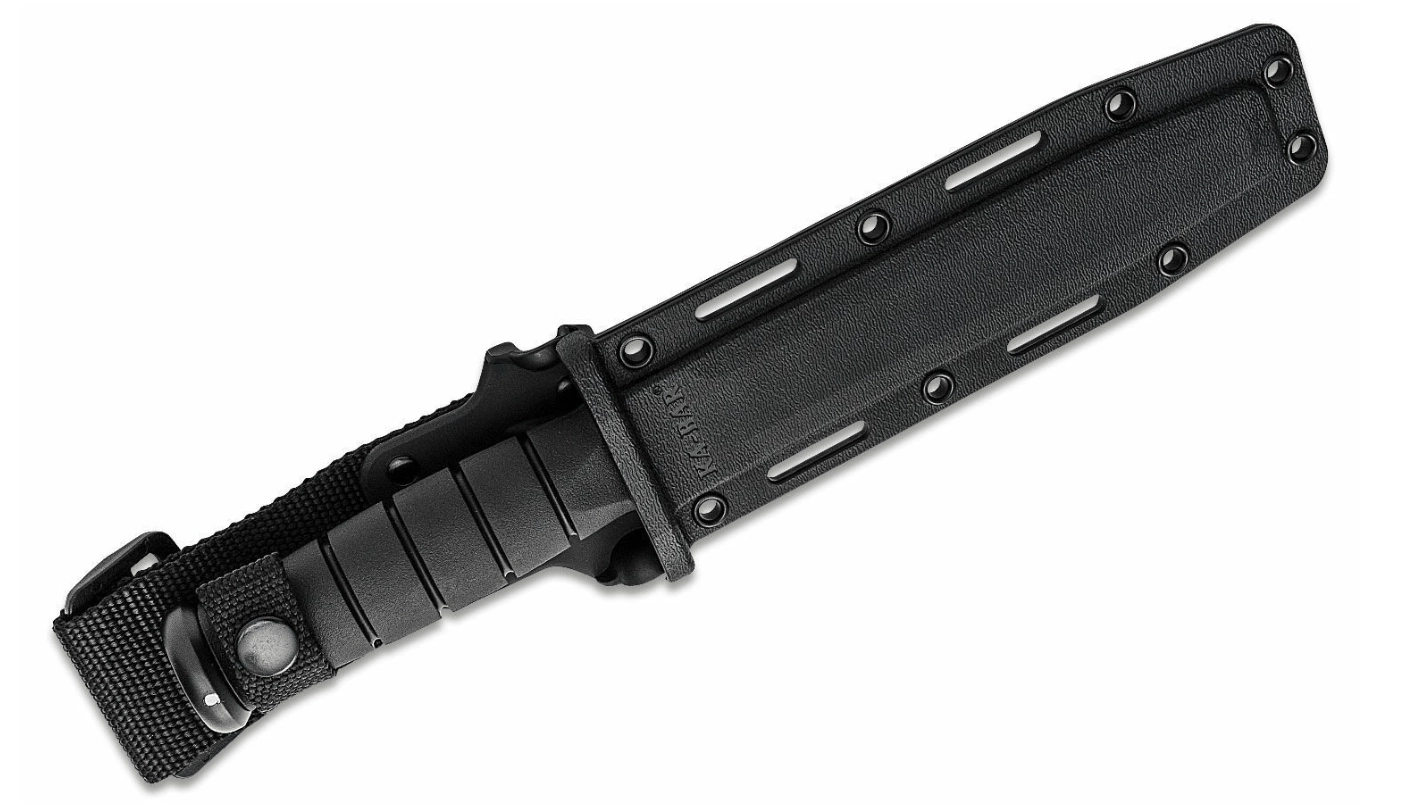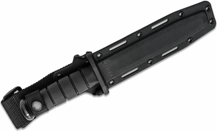 Den alsidige udendørskniv KA-BAR Full Size Black, inspireret af den legendariske USMC-model, tilbyder en stærk Clip Point-klinge i kulstofstål 1095 med sort overfladebehandling, dobbelt parérstykke for et sikkert greb og et skridsikkert Kraton-håndtag. Medfølger en robust Kydex-skede til sikker bæring i naturen og ved taktisk brug.