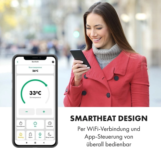 Smarte funktioner løfter komforten til næste niveau: via Wi‑Fi og Klarstein App kan alt indstilles hvor som helst fra, alternativt kan du bruge touch LED‑panelet eller fjernbetjeningen. Den praktiske ugentlige timer gør det muligt at programmere opvarmningen for hver dag. Glaspanelet med IP24 er modstandsdygtigt over for vandsprøjt, så det er ideelt til badeværelset.