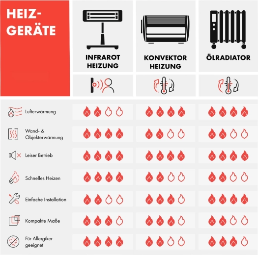 - Varmeapparat, fjernbetjening, 2× stand (hver med 2 hjul), monteringsmateriale, flersproget manual