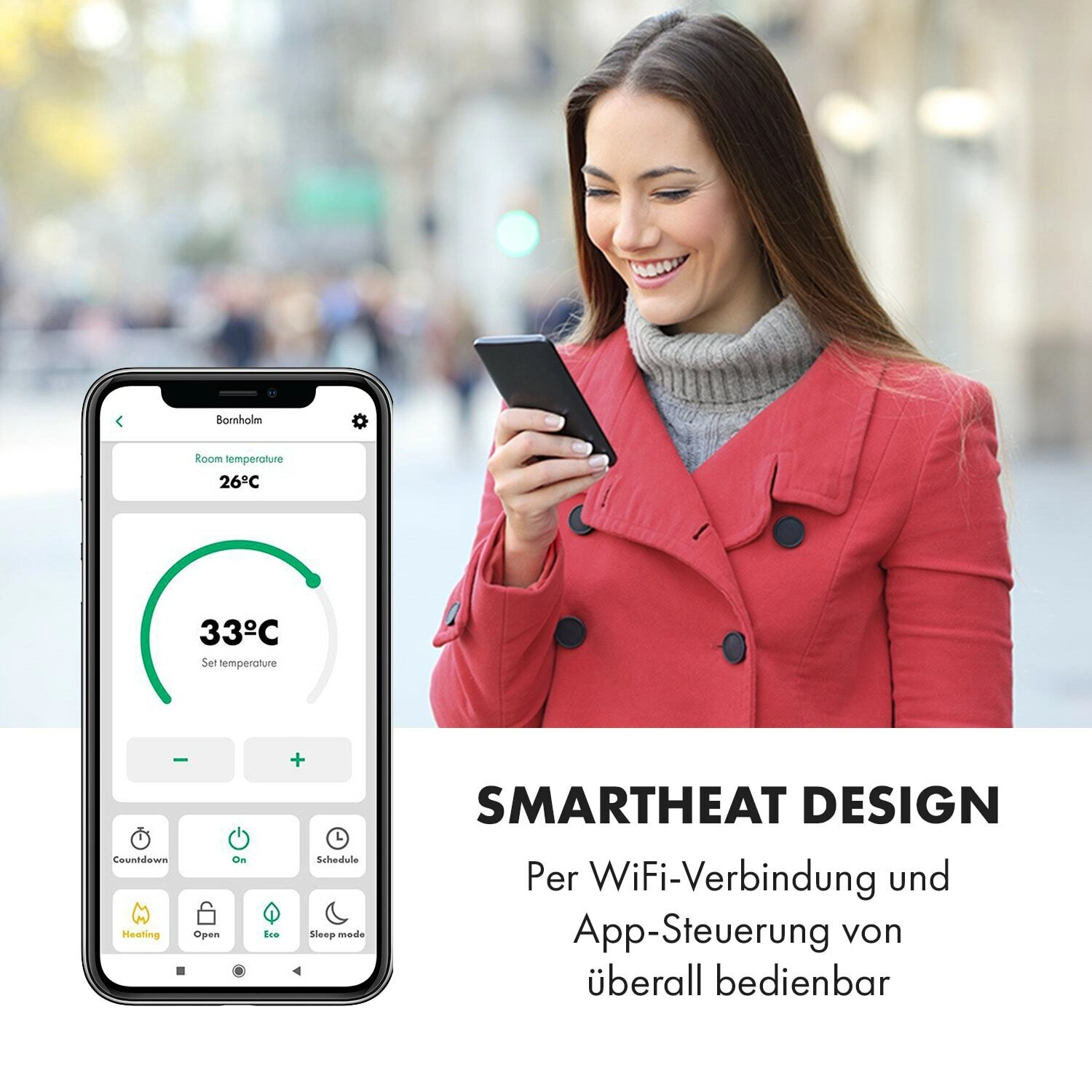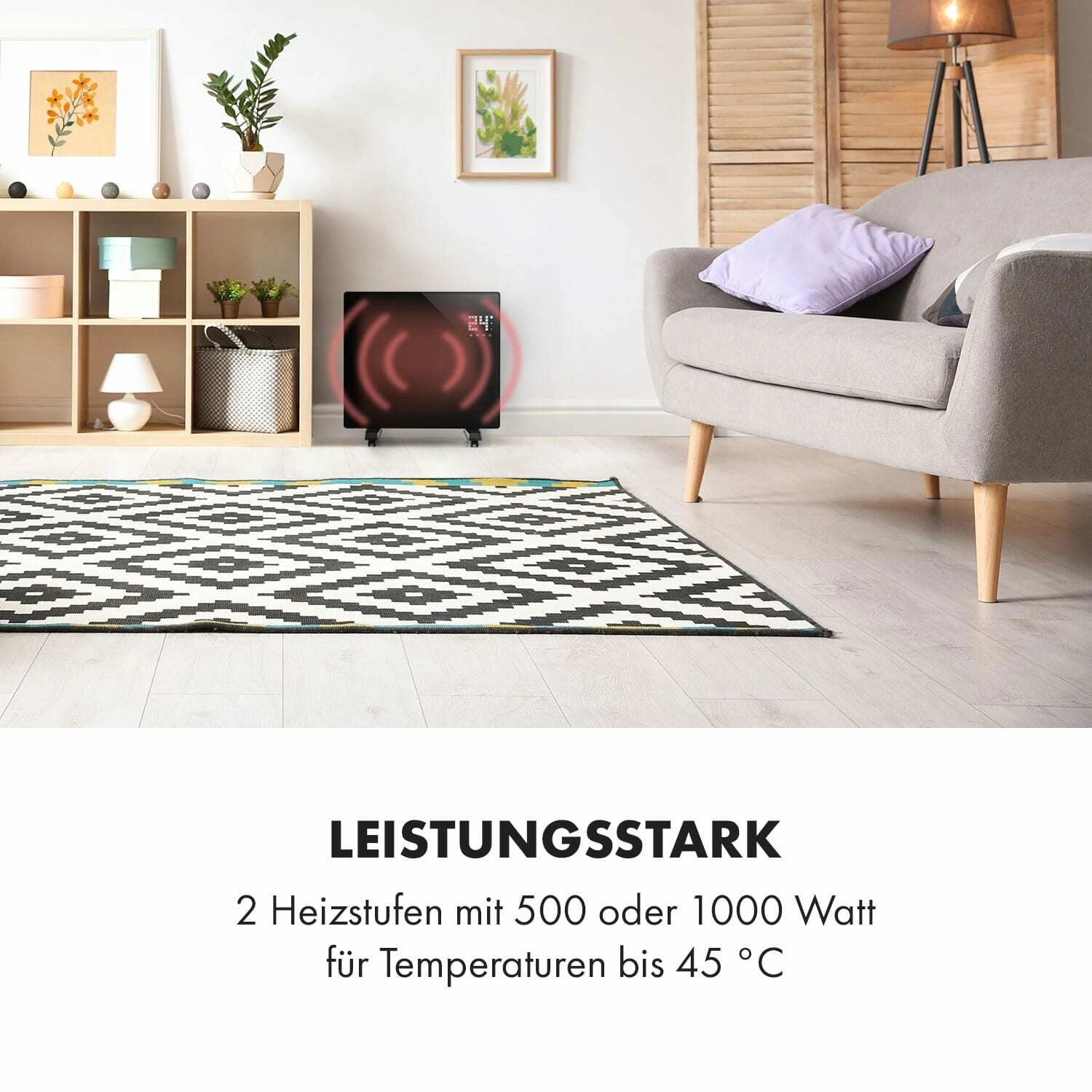 Den stilfulde og stille konvektor Klarstein Bornholm Single Smart skaber behagelig varme på ingen tid. Takket være to effektniveauer (500/1000 W) og en præcis termostat opvarmer den små til mellemstore rum op til 45 °C. ECO-tilstand minimerer forbruget og sparer dermed både energi og penge.