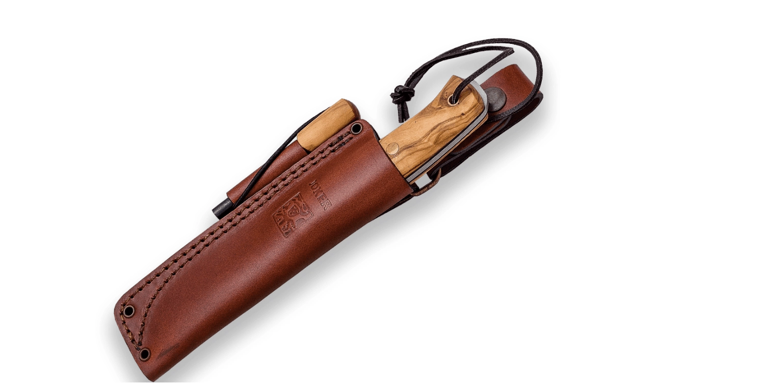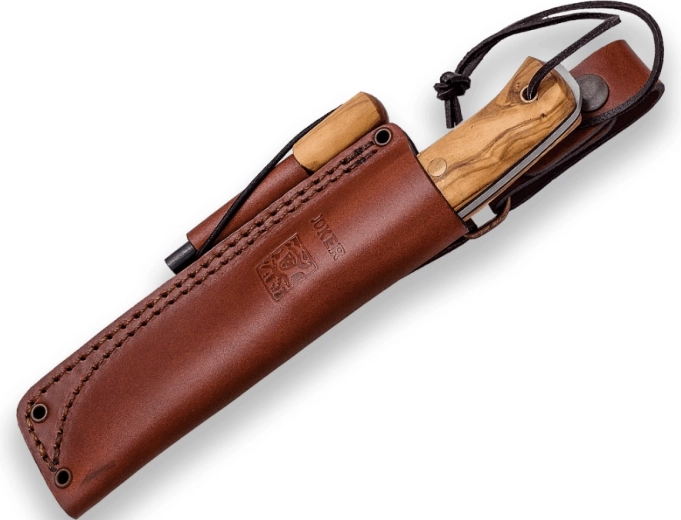 Full-tang konstruktion med klinge i svensk rustfrit stål Sandvik 14C28N giver høj stabilitet og korrosionsbestandighed. Det elegante skæfte i hårdt oliventræ ser ikke blot godt ud, men ligger også sikkert i hånden takket være den behagelige ergonomi. I pakken finder du en læderskede, et ildstål og en snor til ophængning eller sikring.