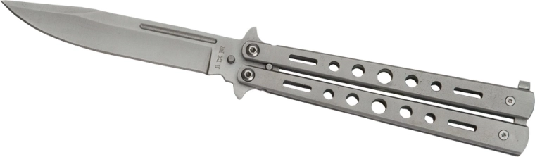 Stilfuld foldekniv af typen balisong til hurtig og underholdende åbning. Den har en enkelt-slebet klinge i rustfrit stål med beskyttende belægning og et fuldmetalhåndtag for lang holdbarhed. I åben position låses den sikkert med en typisk låseklinke.