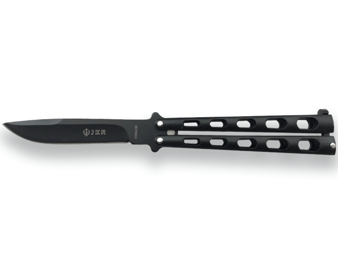 Joker Butterfly er en klassisk “sommerfuglekniv” til hurtig og jævn åbning ved at sprede håndtagets arme. Klingen i rustfrit stål med overfladebeskyttelse sikrer lang levetid og nem vedligeholdelse, mens den helsorte finish giver kniven et elegant og diskret udseende.