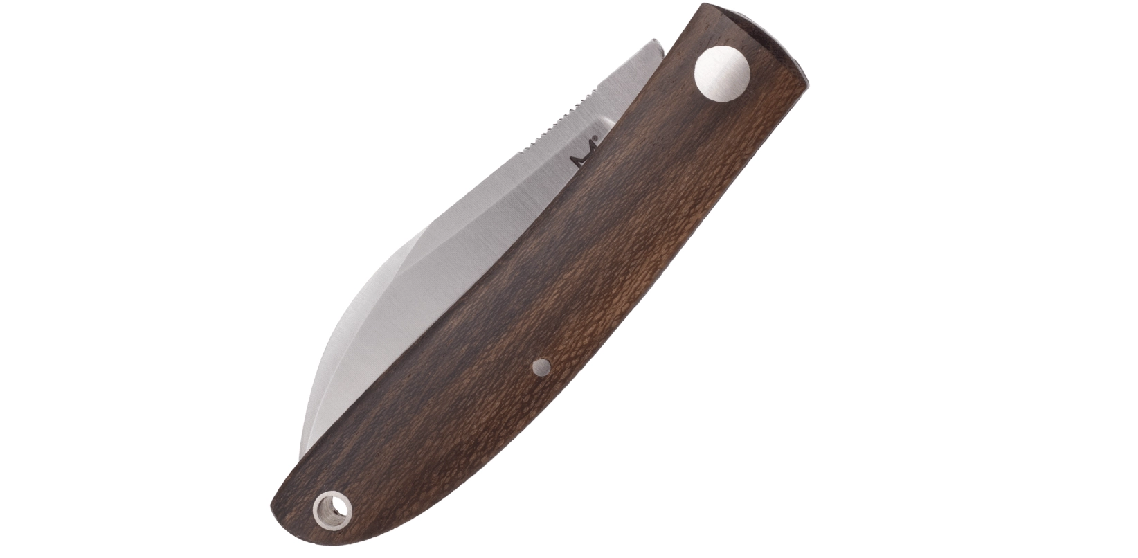 De luksuriøse skæfter af Ziricote-træ ligger behageligt i hånden og har hul til snor for let at kunne trække kniven op af lommen. Kniven leveres med et kvalitetslæderetui, som beskytter både klinge og skæfte under bæring.