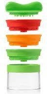 Sikkerheden kommer først: grøntsagsholderen fungerer også som låg for sikker brug og opbevaring. Det åbne design gør det muligt at arbejde med råvarer i forskellige former og diametre. Efter brug adskiller du den nemt og sætter den i opvaskemaskinen.
