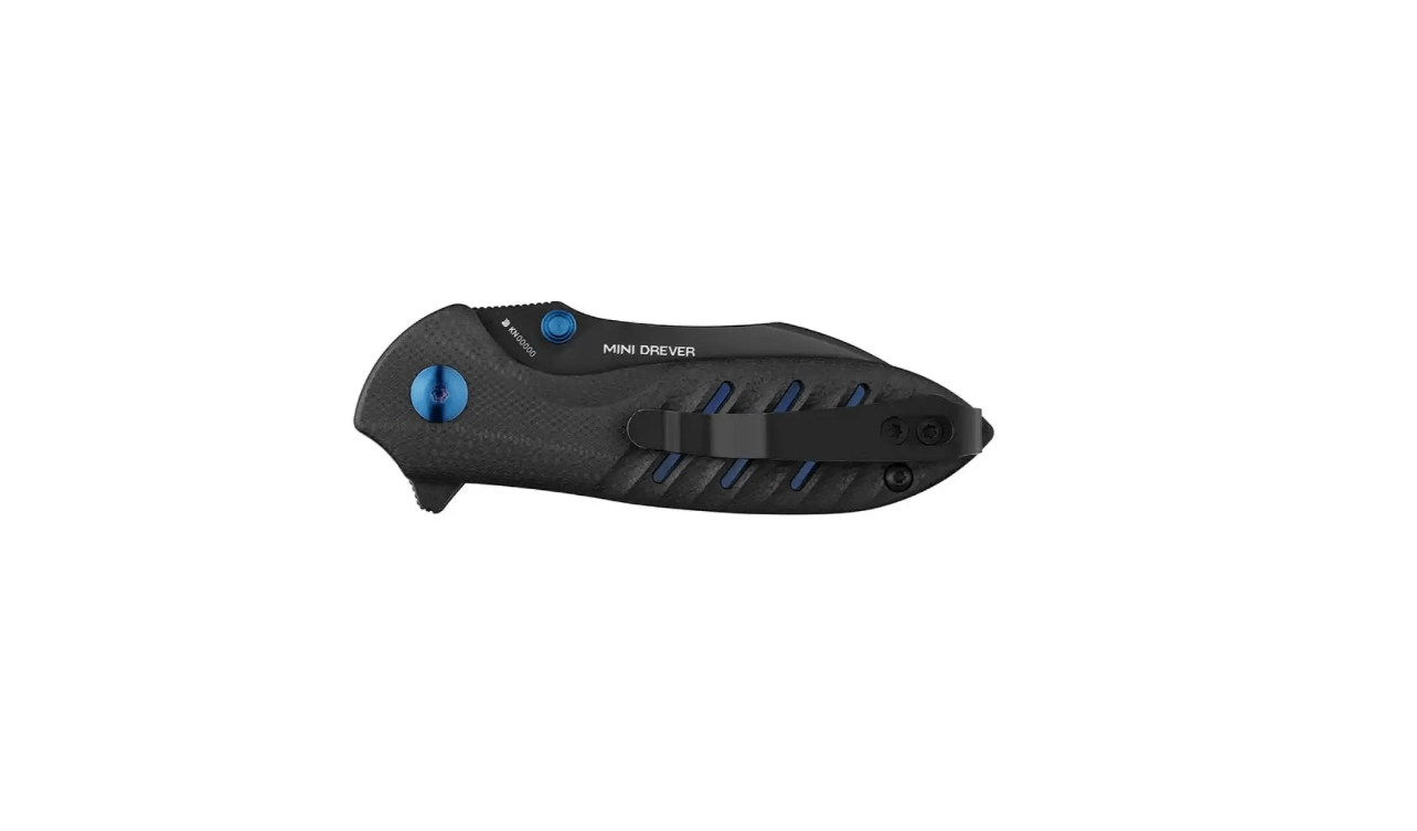 Kompakt og elegant lommekniv Oknife Mini Drever i helsort udførelse, ideel til daglig bæring (EDC). Den tilbyder en klinge i premium N690-stål med titanbelægning, hurtig åbning via flipper eller dobbeltsidede tommelknopper og sikker lås med Liner Lock. Det ergonomiske G10-greb ligger godt i hånden, og clippen muliggør komfortabel bæring i lommen.