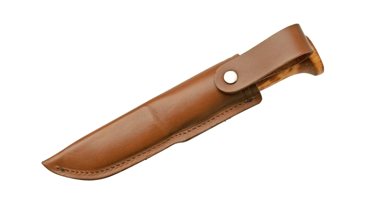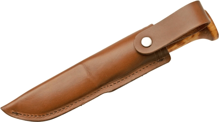 Den faste klinge i rustfrit stål Sandvik 12C27 med glat skær tilbyder pålidelig skæreevne, korrosionsbestandighed og nem slibning i felten. Det håndslebne, polerede og oliebehandlede skæfte af ét stykke krøllet birk giver kniven en unik karakter og et naturligt udtryk. Med i pakken følger en læderskede til sikker bæring.