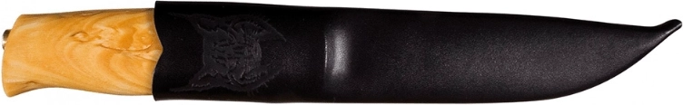 Skæftet i ét stykke krøllet birk er håndslebet, poleret og olieret – ligger naturligt i hånden, glider ikke, og hvert stykke har en unik åretegning. Medfølgende er en læderskede til sikker og stilfuld bæren på bæltet.