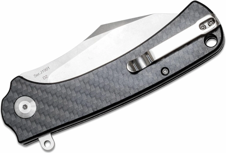 Åbningen er hurtig og glat med flipper, og linerlock-låsen giver sikkerhed under brug. Det ergonomiske skaft i kulfiber i grå udførelse ligger godt i hånden, og lommeclip samt hul til snor gør den nem at bære hver dag.