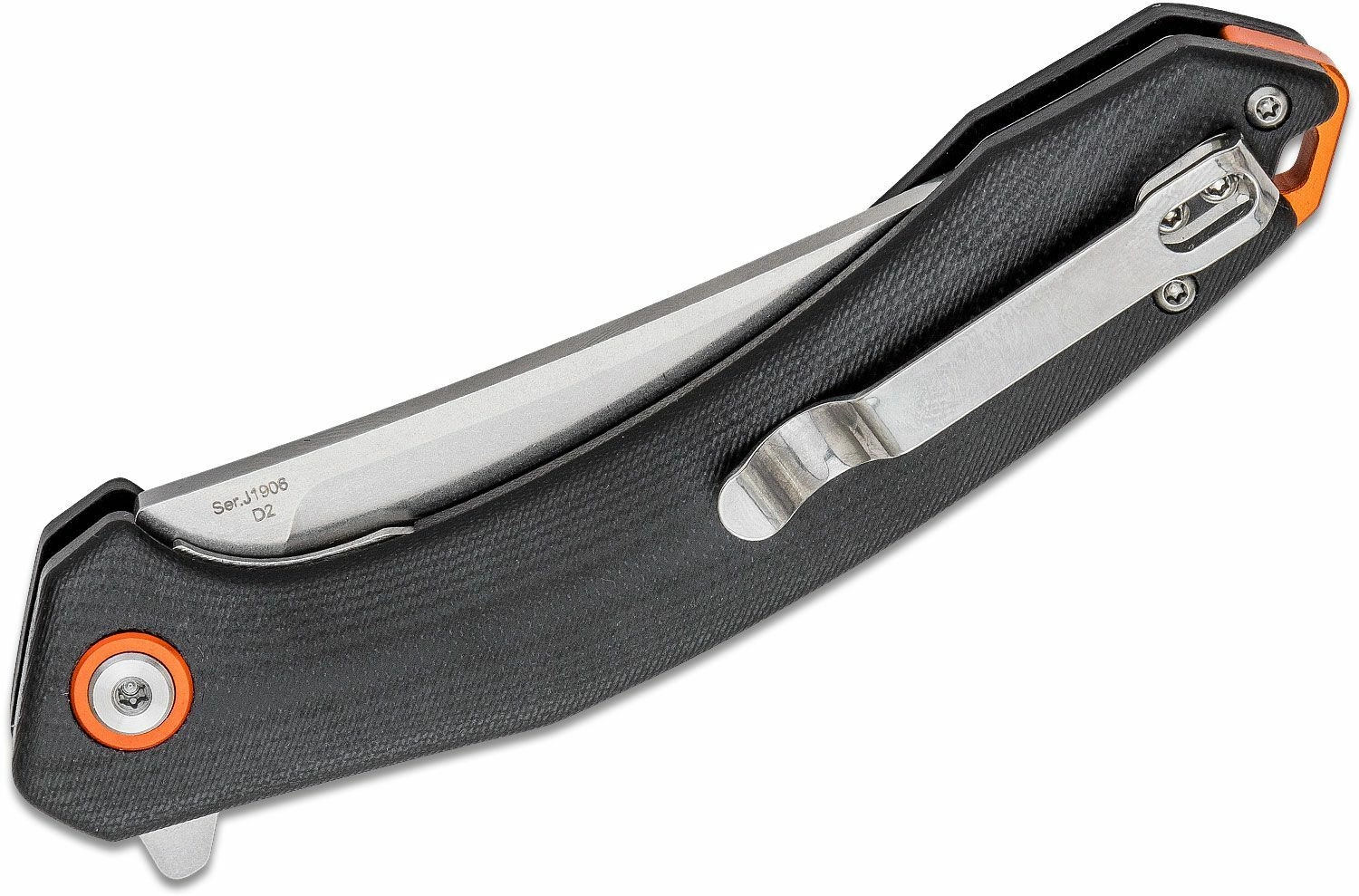 Åbning via flipper er hurtig og jævn, mens linerlock-låsen holder klingen sikkert under brug. Det ergonomiske G10-skæfte fræset med CNC giver sikkerhed i hånden selv i vådt føre. En praktisk lommeclip og et hul til snor gør det nemt at bære og sikre kniven.