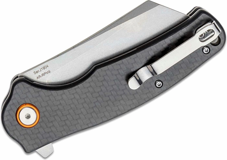 Robust og pålidelig lommekniv CJRB Crag med cleaver-klingetype i pulverstål AR‑RPM9 og stonewash-finish klarer selv krævende opgaver. Takket være de kompakte mål er den ideel til daglig (EDC) bæring både i naturen og derhjemme. Flipper sikrer hurtig åbning, og liner lock giver sikker brug, mens den grå kulfiberskal tilbyder et fast og behageligt greb.