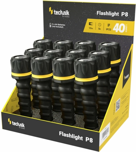 Den kompakte og robuste håndlygte Technik MT-P8 er ideel til daglig brug, arbejde og fritid. Den tilbyder en lysstyrke på 40 lm, en rækkevidde på 10 m og op til 5 timers drift på 2× AA-batterier (ikke inkluderet). Det gummierede hus øger slagfastheden ved fald fra 1 m, og lygten opfylder beskyttelsesklasse IP20.
