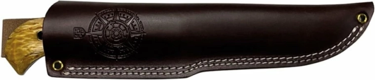 Skæftet af naturligt træ i krøllet birk ligger fantastisk i hånden og giver takket være den naturlige tekstur et sikkert og behageligt greb. I bagenden er der hul til snor, så kniven kan sikres eller hænges op. Med kniven følger en kvalitets brun læderskede for sikker og stilfuld bæring i bæltet.