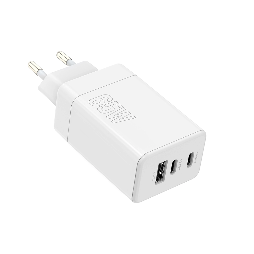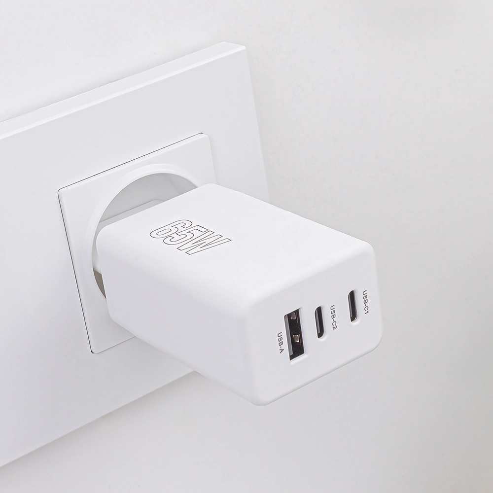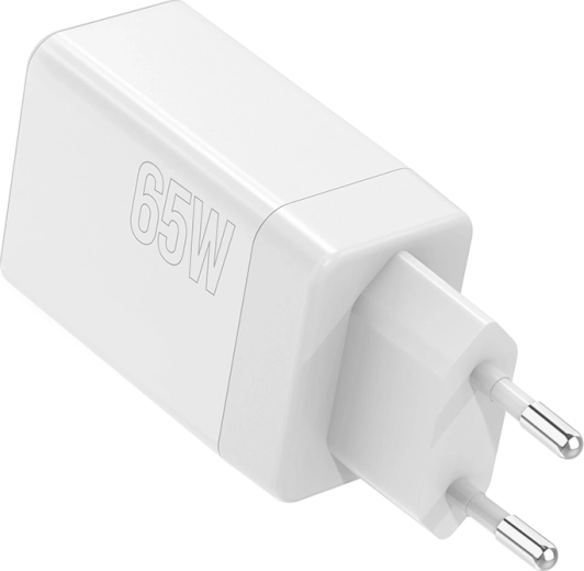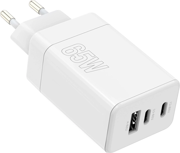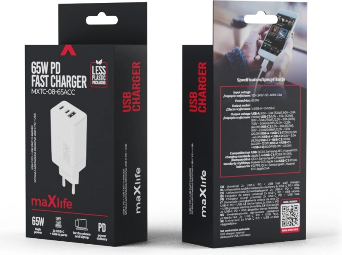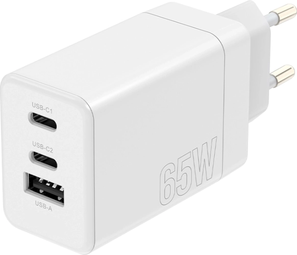 Universel Maxlife vægoplader med effekt på 65 W og teknologierne USB‑C Power Delivery og Quick Charge oplader hurtigt telefon, tablet og bærbar. Takket være 2× USB‑C og 1× USB‑A kan den forsyne op til tre enheder samtidig, og den smarte elektronik tilpasser automatisk effekten til de tilsluttede enheders behov.