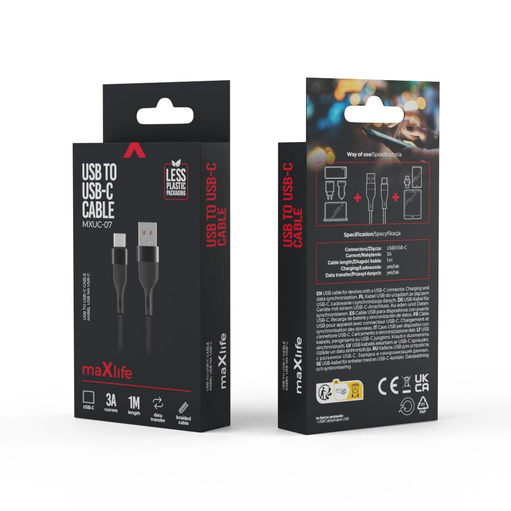 Solid USB – USB‑C-kabel fra Maxlife med nylonflet til pålideligt opladning op til 3 A og hurtig dataoverførsel. Takket være 1 m længde er den ideel til skrivebordet, kontoret og på farten, mens de forstærkede stik forlænger levetiden ved daglig brug.