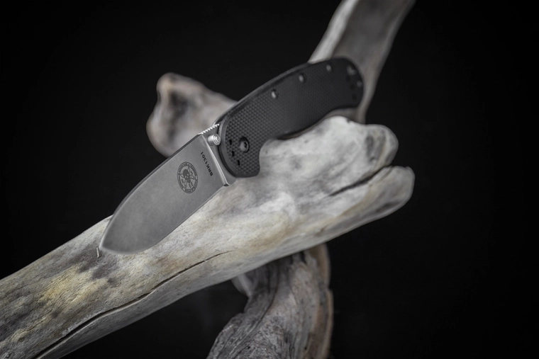 Klinge i værktøjsstål D2 med mat stonewash-finish holder skarpheden fremragende og skjuler brugsspor bedre.